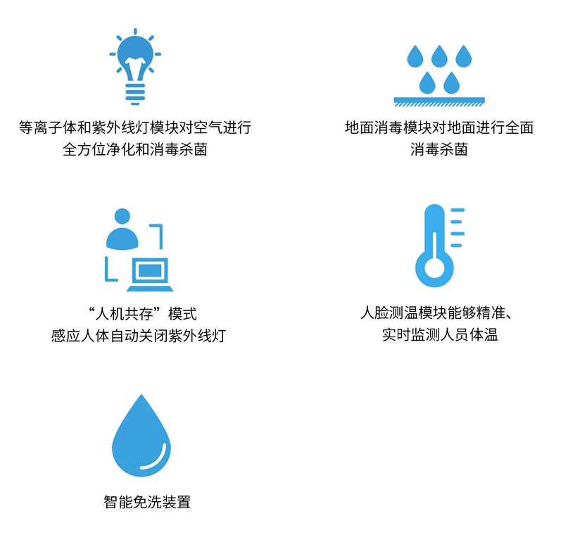 采用等離子體和G強度紫外線燈模塊對空氣進行全方位凈化和消毒殺菌;同時地面消毒模塊對地面進行多面消毒殺菌。產品具有“人機共存”模式,并配置人體感應模塊自動關閉紫外線燈,保證人員安全。同時自帶人體人臉測溫模塊能夠準確、實時監測人員體溫狀況并對異常體溫實時通報處置。產品智能免洗裝置,給用戶提供更加方便有效的衛生需求。