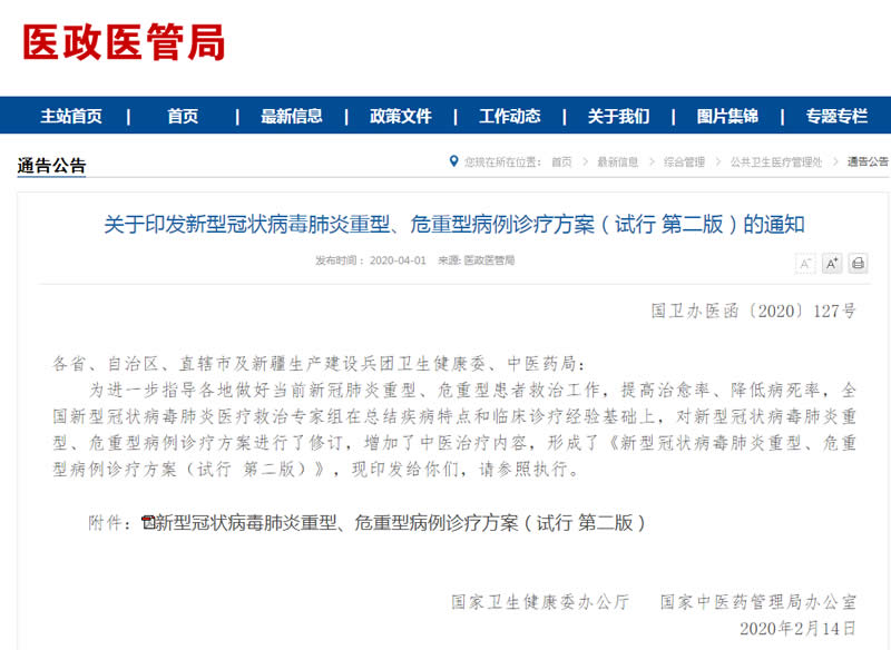 為進一步指導各地做好當前新G肺炎重型、危重型患者救治工作,提G治愈率、降低病死率,全國新型G狀病毒肺炎醫療救治專家組在總結疾病特點和臨床診療經驗基礎上,對新型G狀病毒肺炎重型、危重型病例診療方案進行了修訂,增加了中醫治療內容,形成了《新型G狀病毒肺炎重型、危重型病例診療方案(試行 第二版)》,現印發給你們,請參照執行。
