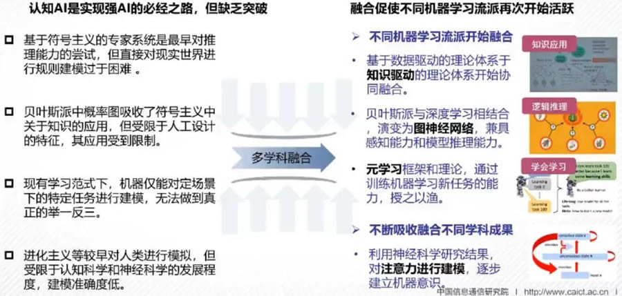 雖然AI已經廣泛用于日常生活中,但當前仍然處于弱AI階段,強AI“道艱且長”。認知AI是實現強AI的必經之路,但缺乏突破,融合不同機器學習流派開始活躍。