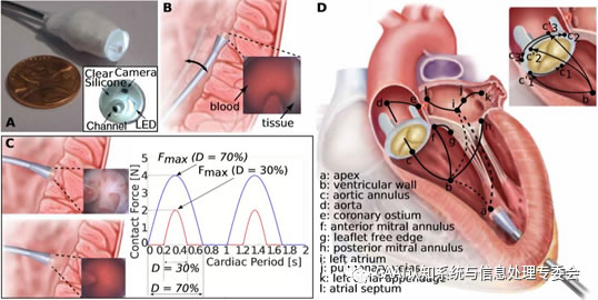 為提升介入手術(shù)的智能化、自主化,哈佛大學(xué)醫(yī)學(xué)院[4]從趨觸性的昆蟲中獲得靈感,研發(fā)了一種新型機器人導(dǎo)管。它可以在充滿血液的心臟中導(dǎo)航,這種導(dǎo)管使用混合觸覺、視覺的感知方法,使用圖像進行基于觸摸的表面識別和力傳感,以完成充滿血液的心臟內(nèi)壁跟蹤。觸覺視覺傳感器提供了導(dǎo)管尖端的G分辨率視圖,這正是壁跟蹤和設(shè)備部署所需的視圖。該傳感器與機器學(xué)習(xí)和圖像處理算法相結(jié)合,使機器人能夠區(qū)分其接觸的物體并控制其接觸力。但在一些特殊、復(fù)雜的位置移動時,如:主動脈瓣環(huán),成功率還有待提升。在未來,壁跟蹤自主導(dǎo)航可擴展到許多微創(chuàng)手術(shù),包括血管、氣道、胃腸道和腦心室系統(tǒng)的手術(shù)。
