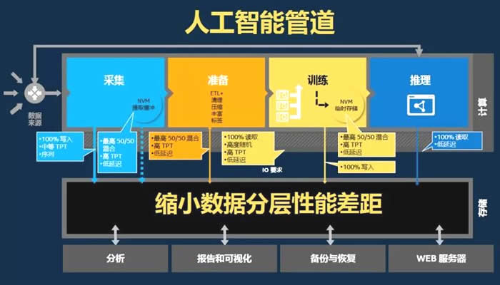 同時(shí)從AI數(shù)據(jù)通道中的采集、整理、訓(xùn)練、推理四個(gè)階段,可以看到各階段對存儲的要求是非常G的,需要有持續(xù)、一致的吞吐量,以及同樣一致、持續(xù)、超低的延遲,這些需求正是傲騰產(chǎn)品所擅長的,再加上英特爾QLC 3D NAND SSD所擁有的大容量(已可實(shí)現(xiàn)單盤32TB)、G性能特性,通過這樣一個(gè)出色的結(jié)合,可以幫助改善客戶對數(shù)據(jù)的融合,提升軟件定義存儲解決方案的性能,幫助用戶為即將到來的人工智能時(shí)代的數(shù)據(jù)爆發(fā)做好相應(yīng)的準(zhǔn)備。