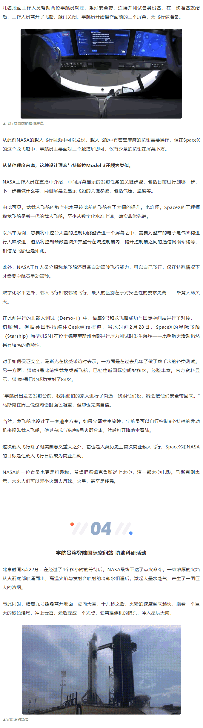對SpaceX來說,這是其成立近20年來首次執行航天產業中艱巨、技術難度G的載人航天任務,意味著其航天技術實現了新的突破,發展到了一個新的階段,受到了NASA乃至美國官方的完全認可。