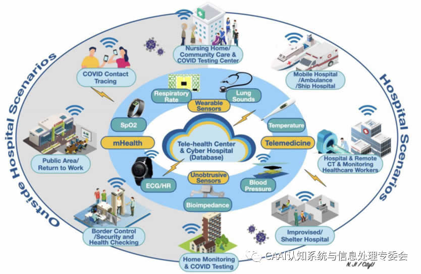 圖1 可穿戴設(shè)備在不引人注目的傳感器和遠程保健系統(tǒng)在流行病期間的應(yīng)用場景(上面的一些原始設(shè)計概念是從R.Pettigrew博士2012年在國家科學(xué)院舉行的IEEE生命科學(xué)大挑戰(zhàn)會議上的演示中借用的)[1]
