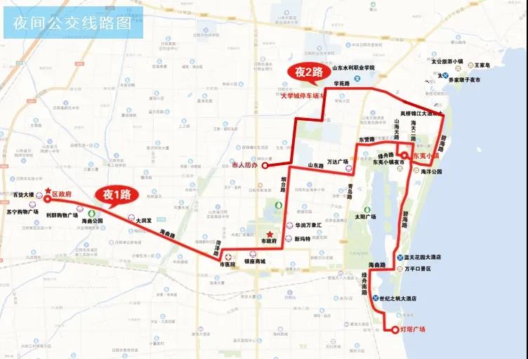 為助力夜間經濟發展,進一步滿足市民夜間出行需求,經前期調研,擬于6月20日起試運行由“東夷小鎮北”站經東營路、青島路、山東路、煙臺路、泰安路、菏澤路、海曲路至“東港區政府”站的公交夜1路,由“市人防辦”站經山東路、煙臺路、濱州路、學海路、學苑路、太公島二路、碧海路、海曲路、綠舟南路至“燈塔廣場”站的公交夜2路。具體情況如下:
