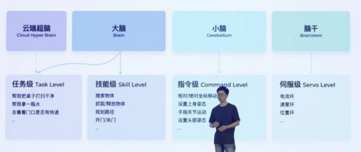 “小腦”負責產生運動控制指令生成,比如設置上身姿態、控制指關節運動、控制頭部姿勢等,涉及運動學、動力學;另外“腦干”這一層級主要是解決底層的運動控制能力問題,比如所有電