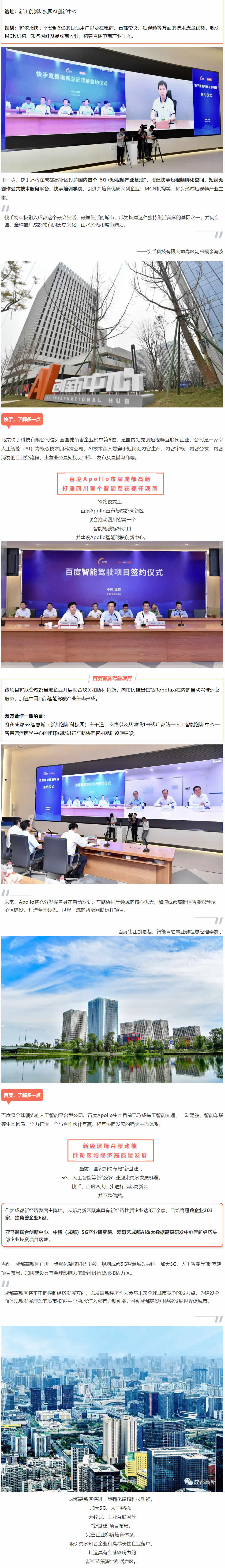 成都G新區分別與頭部短視頻平臺快手、中國互聯網BAT三巨頭之一的百度簽約,宣布快手直播電商全國總部項目和百度智能駕駛項目落戶新川創新科技園。