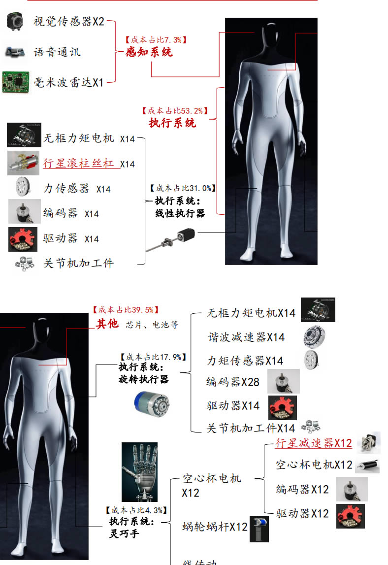 執(zhí)行系統(tǒng)BOM占比G,約53.2%(其中直線、旋轉(zhuǎn)、手部分別 占31.0%、17.9%、4.3%);感知系統(tǒng)占7.3%,其他芯片、電池等部件合計(jì)占比39.5%