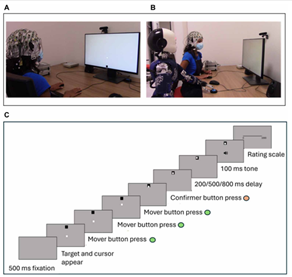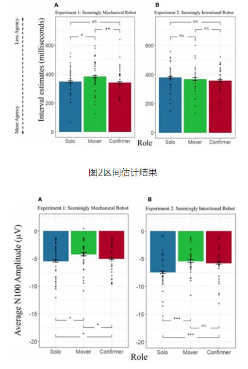 在這項(xiàng)研究中,科學(xué)家們使用了時間間隔估計(jì)任務(wù)(如圖2)和腦電圖(EEG)(如圖3)來評估人們在與機(jī)器人合作時是否能感受到共同代理感(Sense of Joint Agency, SoJA),以及這種感覺是否受到人們對機(jī)器人意圖歸因的影響。