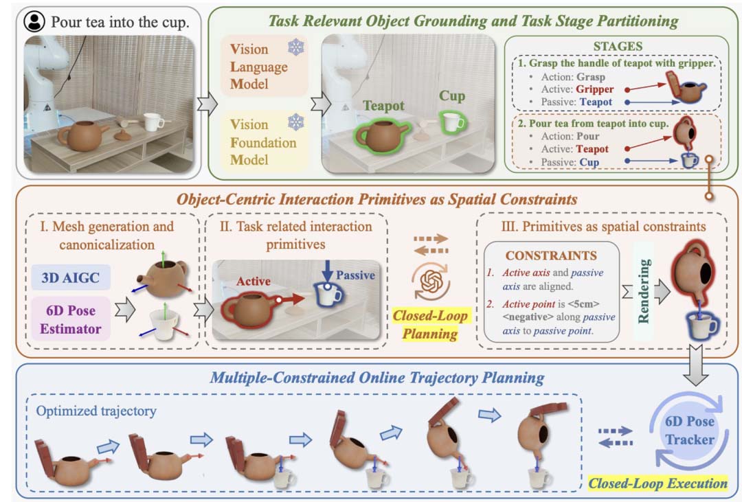 以物體為中⼼的交互基元作為空間約束:通過 3D 基座模型⽣成任務(wù)相關(guān)物體的 3D 模型和規(guī)范化空間(canonical space),使 VLM 能夠直接在該空間中采樣 3D 交互基元,作為 Action 的空間約束,從⽽優(yōu)化求解出 Active 物體在 Passive 物體規(guī)范坐標(biāo)系下的⽬標(biāo)交互姿態(tài)。