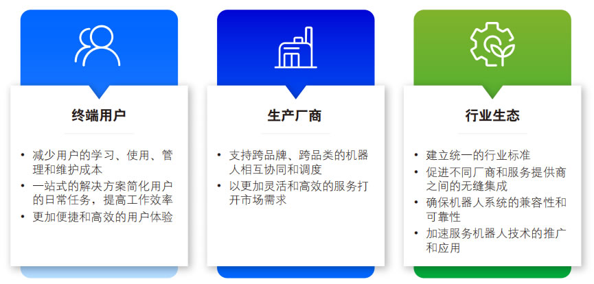 開放性的全棧式智能服務機器人生態對于整個 行業而言,是推動技術進步和市場發展的關鍵 力量。通過建立統一的行業標準,能夠降低技術壁壘,促進不同廠商和服務提供商之間的無縫集成。這種標準化不僅有助于確保機器人系 統的兼容性和可靠性,還能加速服務機器人技 術的推廣和應用,從而提升服務機器人在各個 領域的滲透率和普及度。隨著標準的統一,更 多的創新應用和服務模式得以涌現,推動整個 行業的健康發展。