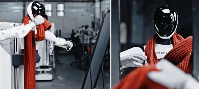 1)機器人保持動作柔順性與位姿穩定性,雙手靈巧配合,可以完成具有生物運動特征的圍巾佩戴任務,先模型通過觀察鏡子中圍巾和頭的相對位置,完成圍巾的初始佩戴, 然后根據兩側的長度比例,左手準確的握住需要調整的一端,將其拉到適當的位置,然 后右手接過左手遞過來的圍巾執行“圍”的螺旋纏繞動作。