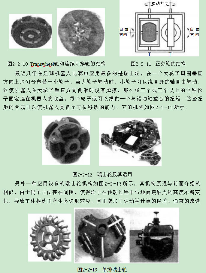 連續切換輪的基礎為Transwheel 輪,由一個輪盤和固定在輪盤外周的滾子構 成。輪盤軸心同滾子軸心垂直,輪盤繞軸心由電機驅動轉動,滾子依次與地面接 觸,并可繞自身軸心自由轉動,結構如圖2-2-9所示。采用這種輪子設計了幾種不 同的足球機器人17.18],所存在的問題與Swedish 輪相似,就是輪盤轉動時,滾子同 地面接觸不連續,使機器人產生振動和打滑。