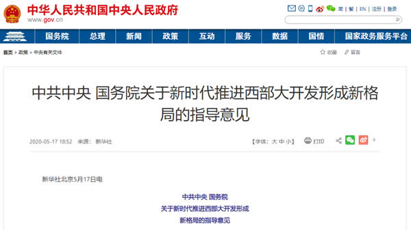 5月17日,、國務院發(fā)布了一份將改寫東西格局的重磅文件——《關(guān)于新時代推進西部大開發(fā)形成新格局的指導意見》(下稱《意見》),強化舉措推進西部大開發(fā)形成新格局。
