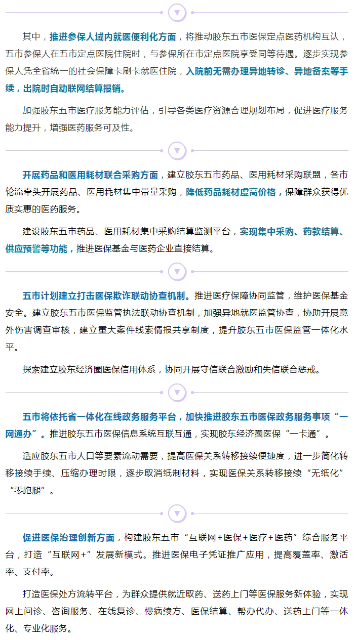 《行動方案》是在山東省醫保局指導下,由青島、煙臺、威海、濰坊、日照五市醫保局會商共同制定。《行動方案》明確,通過構建“就醫服務便捷、藥械采購協同、醫藥產業集聚、打擊騙保聯動、信息互通共享”的膠東五市醫保發展共同體,促進五市醫保政策更加均衡,醫保服務更加便捷,醫藥價格更加優惠,全力支持和服務膠東經濟圈一體化發展大局。
