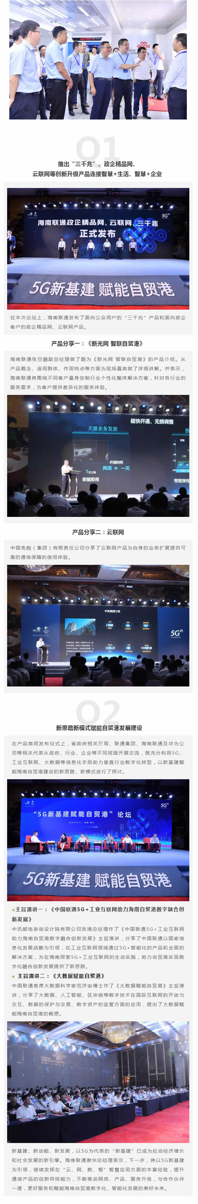 8月7日,海南聯通在?趤喬貒H會議中心舉辦“5G新基建 賦能自貿港”論壇,并隆重發布了面向公眾用戶的三千兆產品和面向政企客戶市場的政企精品網、云聯網產品。海南省工業和信息化廳、海南省通信管理局、海南省大數據管理局以及中國聯通集團公司、華為公司等業界專家和來自政府、企事業單位約200名人員出席了本次論壇活動。