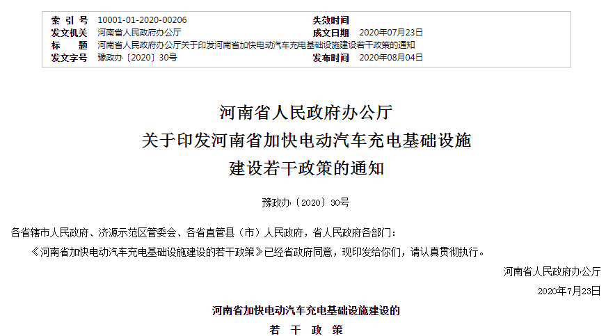 關于印發河南省加快電動汽車充電基礎設施 建設若干政策的通知