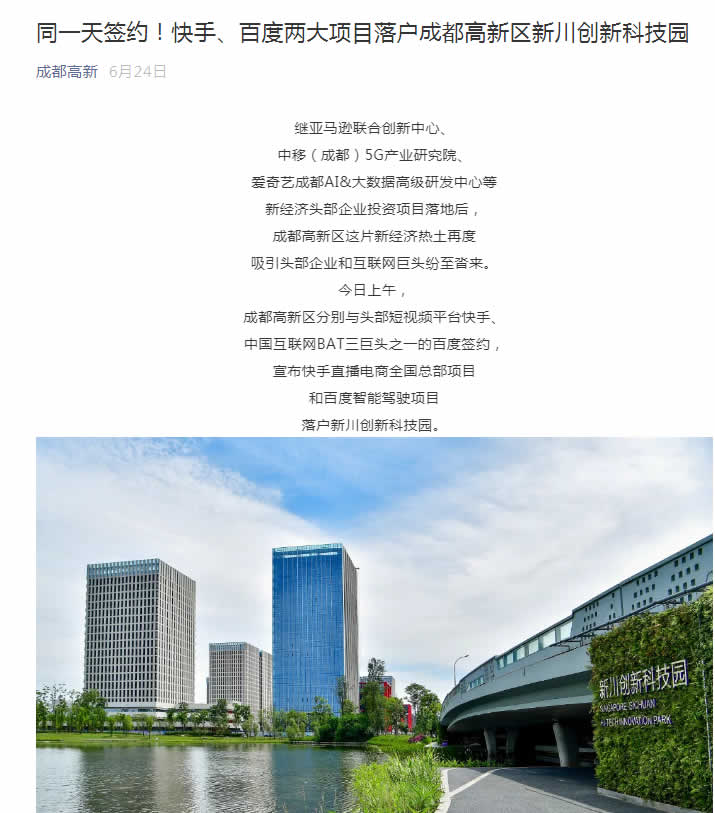 新川創新科技園于2012年正式啟動建設,是新加坡與四川省攜手打造的國際合作共建園區,由中新雙方合資組建中新公司進行整體規劃、開發。園區圍繞人工智能、新醫學、5G通信等產業,重點布局國際知名企業的研發中心和區域總部。
