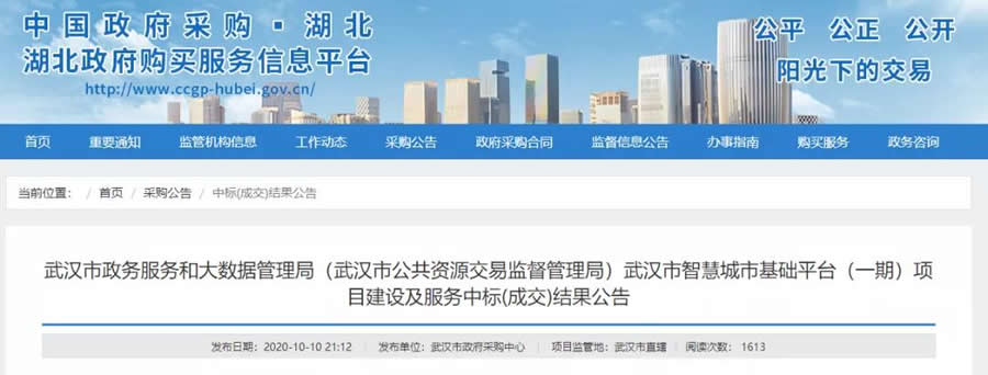 2020年10月10日,武漢市智慧城市基礎平臺(一期)項目建設及服務中標(成交)結果公告發布,武漢烽火信息集成技術有限公司(聯合體:騰訊云計算(北京)有限責任公司34997萬元中標。