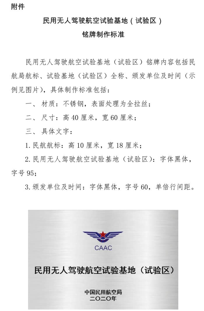 請(qǐng)首批民用無(wú)人駕駛航空試驗(yàn)基地(試驗(yàn)區(qū))所屬地方政府結(jié)合本地實(shí)際,按照各自目標(biāo)定位,進(jìn)一步加強(qiáng)工作推進(jìn),完善運(yùn)行管理機(jī)制,落實(shí)重點(diǎn)任務(wù),做好試驗(yàn)基地(試驗(yàn)區(qū))建設(shè)和運(yùn)行相關(guān)工作,試出成效、確保安全;并按照統(tǒng)一標(biāo)準(zhǔn)自行制作試驗(yàn)基地(試驗(yàn)區(qū))銘牌(標(biāo)準(zhǔn)見(jiàn)附件2) 。