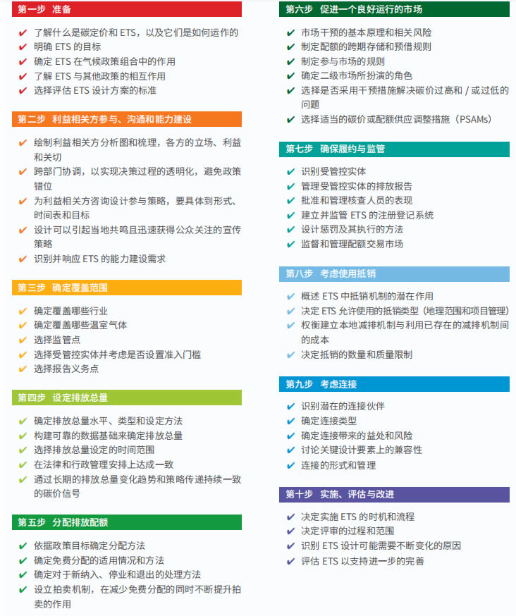 這些步驟之間相互依存,每一步所作的選擇都將對其他步驟的決策產生重要影響。在實踐中,ETS 的設計過程是“迭代”而 非“線性”的。2016 年初版手冊發布之后,隨著 ETS 在各個 國家和地區的發展,很多新見解、新方法和新設計思路都影響著 ETS 的運行方式,也進一步加深了我們對于 ETS 的理解和認識。所有這些新內容我們都在本手冊的相關章節中予以更新。