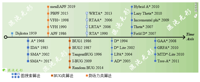 圖規(guī)劃算法根據(jù)路徑生成方式的不同分為三類,其中以圖搜索算法為主,以及BUG算法和勢場力算法。