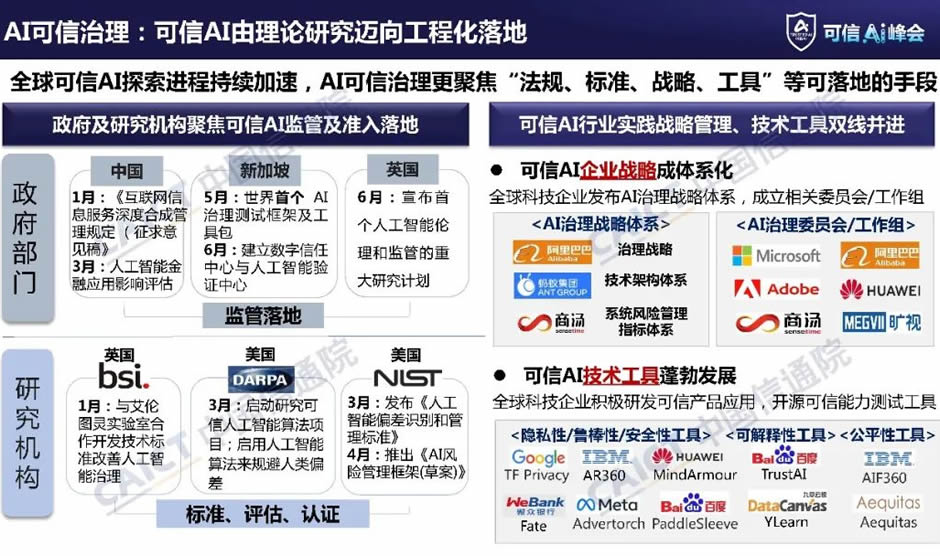 可信AI由理論研究邁向工程化落地。隨著人工智能技術(shù)的快速發(fā)展,社會(huì)各界對(duì)可信AI研究已經(jīng)從理論探索逐步走向工程化落地實(shí)踐。政府與研究機(jī)構(gòu)相關(guān)政策和規(guī)范從宏觀指導(dǎo),開始向可操作、可落地的規(guī)范演進(jìn)。在法律監(jiān)管層面,各政府部門的法規(guī)政策愈發(fā)重視實(shí)施和操作。例如新加坡于5月出臺(tái)世界AI治理測(cè)試框架及工具包;英國6月宣布人工智能倫理和監(jiān)管的重大研究計(jì)劃。