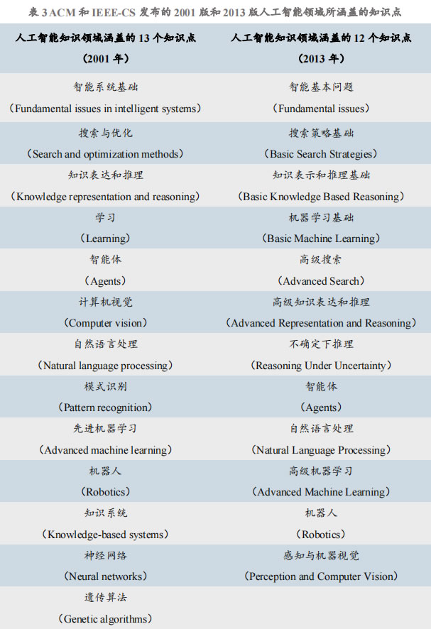 2001 年, ACM 和 IEEE-CS 聯(lián)合工作組發(fā)布了計算機課程體系 Computing Curricula 2001 OComputing Curricula 2001 將計算機課程體系分為 14 個知識L域, 其中用“智能系統(tǒng) (Intelligent System) ”來指代人工智能O在這版計算機課程體系 中, 人工智能知識L域相關(guān)內(nèi)容被分為智能系統(tǒng)基礎(chǔ)、搜索與優(yōu)化、知識表達和 推理、學(xué)習(xí)、智能體、 計算機視覺、 自然語言處理、 模式識別、先進機器學(xué)習(xí)、 機器人、知識系統(tǒng)、神經(jīng)網(wǎng)絡(luò)和遺傳算法等 13 個知識點O從這 13 個知識點可以 看出,人工智能知識L域內(nèi)容基本成型O