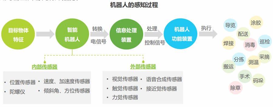 傳感器是機(jī)器人具有類(lèi)人知覺(jué)與反應(yīng)能力的基礎(chǔ),它起到內(nèi)部反饋控制,感知并與外部環(huán)境產(chǎn)生交互的作用。依據(jù)檢測(cè)