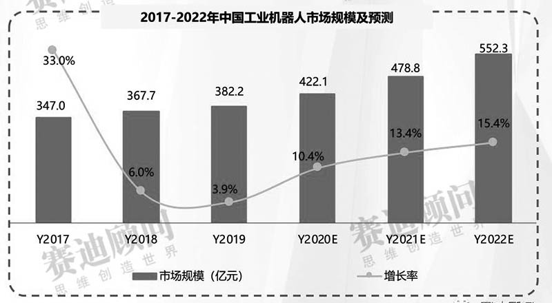 2019年,工業機器人市場規模受下游汽車、電子電氣等行業景氣度下滑的影響,增速較上年放緩,呈現下降趨勢,但總體市場規模仍然呈現穩定上升趨勢,達382.2億元,預計到2022年,工業機器人市場規模將進一步增長,達到552.3億元 。